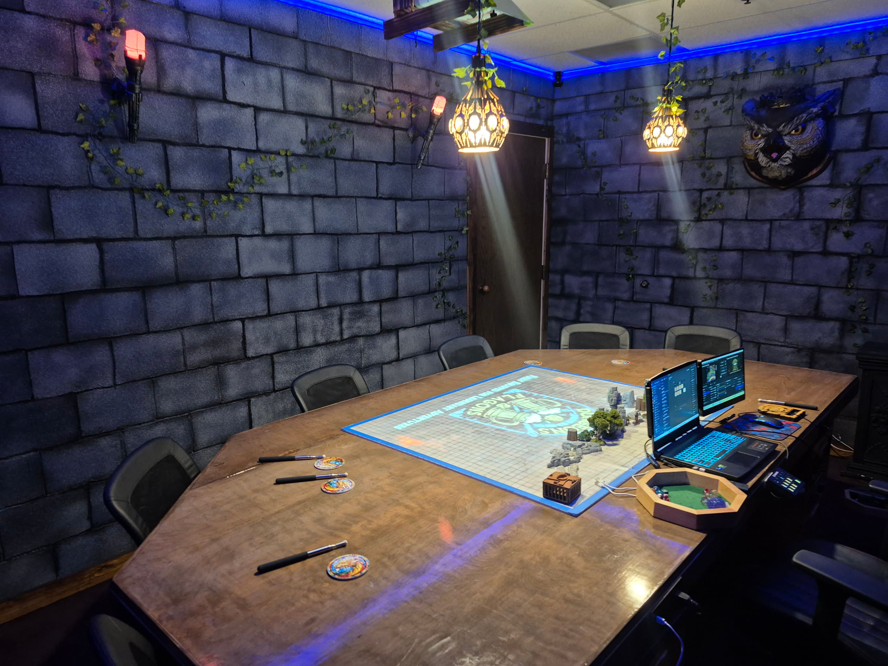 Our room is fully equipped with the tools and toys for you and your party to have maximum fun without needing to bring anything but your imagination! We can supply premade characters, dice and trays for players. For GMs, we have over 600 miniatures, terrain pieces, a trove of digital maps and music, lighting effects, a soundboard, condition rings, area of effect rulers and handmade props to make it all come to life.